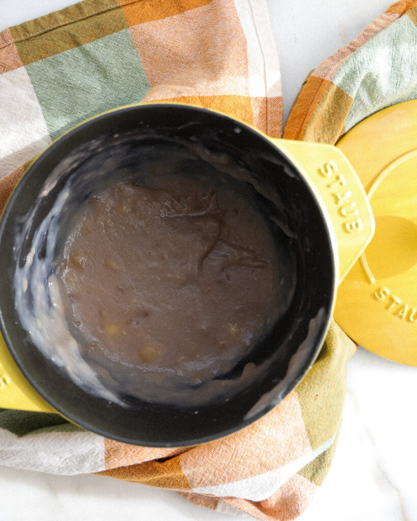 First, there’s a tangzhong banana base. If you don’t know what this is, it’s a Chinese method to make the fluffiest rolls around. What you do is heat up water and flour together until it goes from a liquid to a paste. This helps create a tender, softer roll that stays plush for longer than an average roll. The tangzhong method is something I first used in these buns (which are a blog favorite!) and I’m never looking back. These cinnamon rolls use the tangzhong method of heating up water with flour, but it also uses a mashed banana. This gives the rolls the same intense softness, but with a bit more flavor.