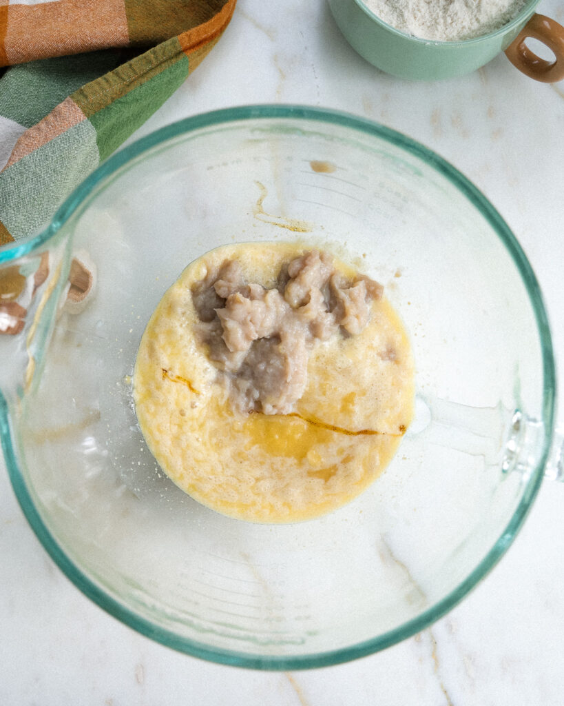 - Mash up one large banana very well. Whisk that into the wet ingredients along with 1 teaspoon vanilla bean paste and the tangzhong.