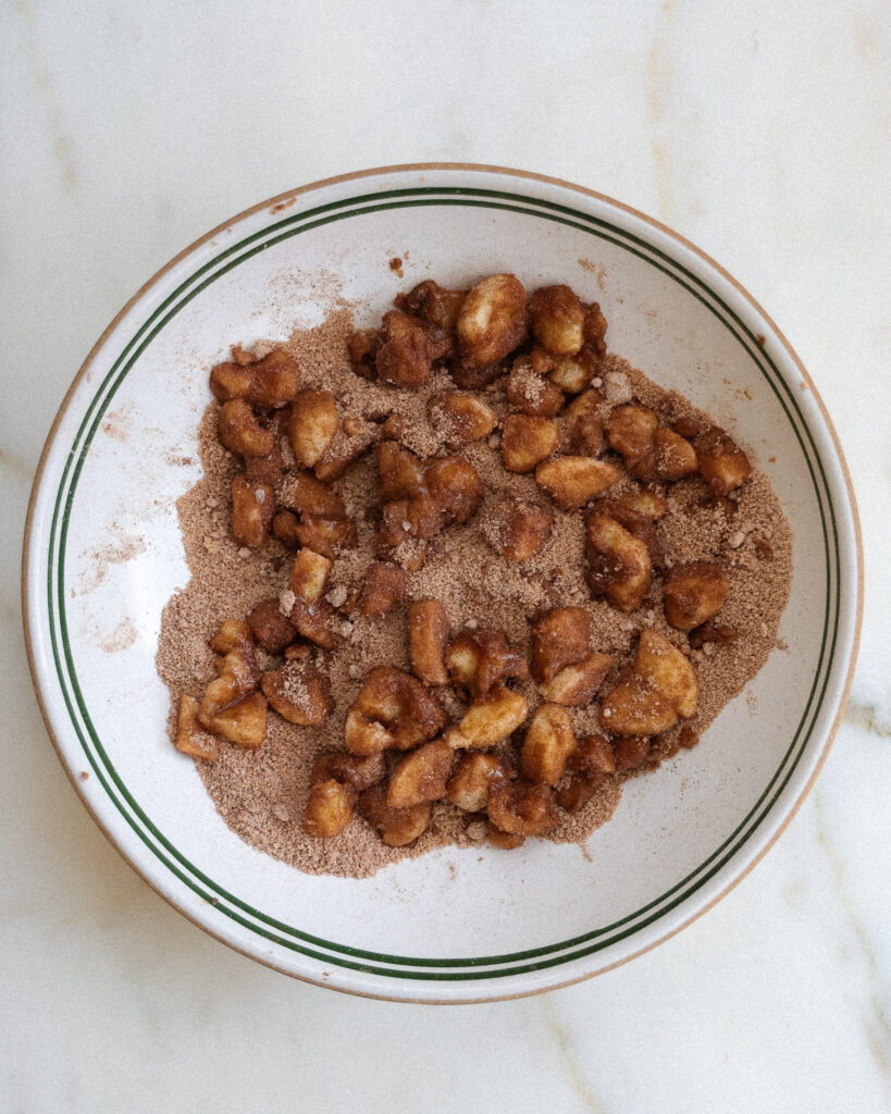 - Quarter a banana lengthwise, then cut crosswise so you get a bunch of pea-sized banana pieces. Toss these in the sugar mixture so they are fully coated.