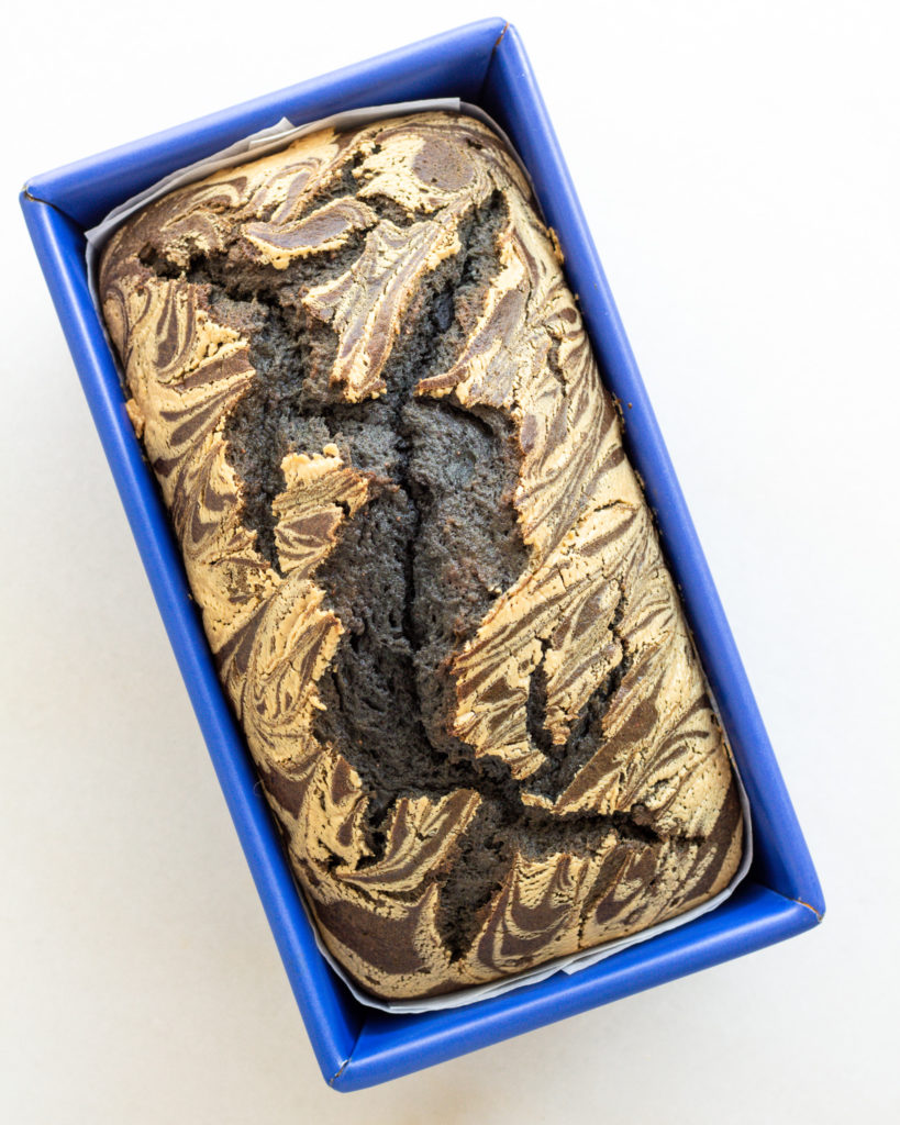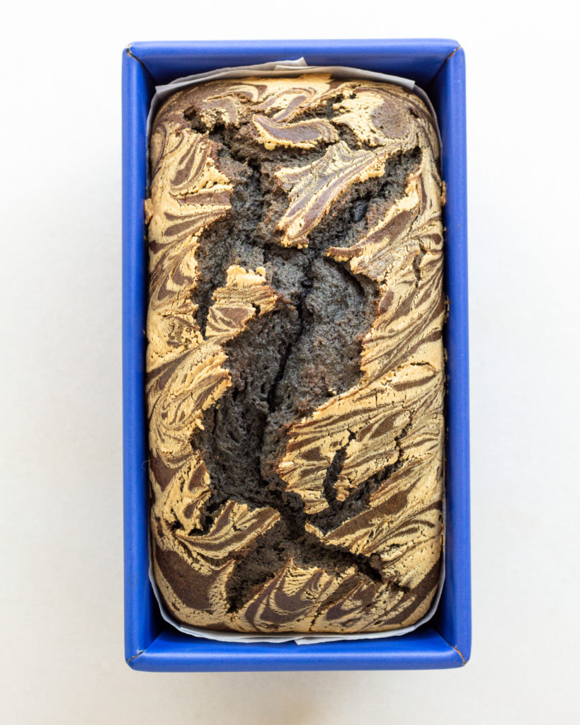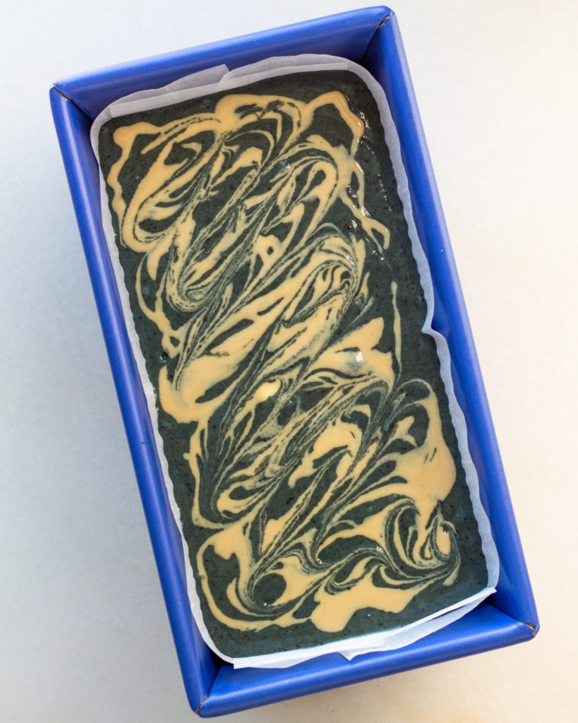 • Line a 9″ by 4″ loaf pan with parchment paper. Pour in the batter.