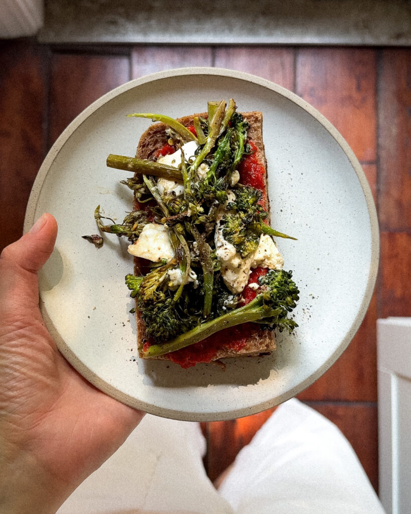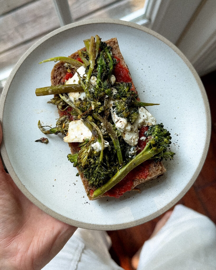 - Add a swipe of the roasted pepper paste to the bottom of each slice of bread and pile the broccolini mix on top. Dot with more pepper paste if you like, season with a few cracks of black pepper, and eat immediately.