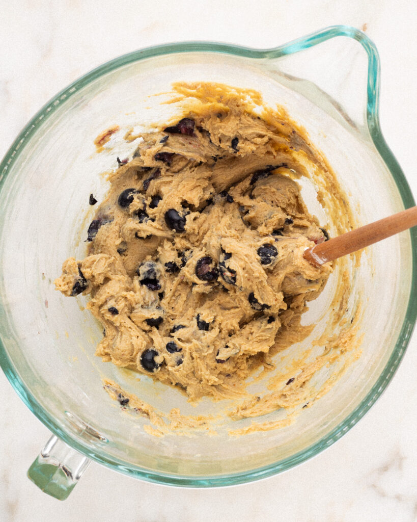 - Add the blueberries and mix in with a spatula, make sure not to break any or they will make your dough too wet.