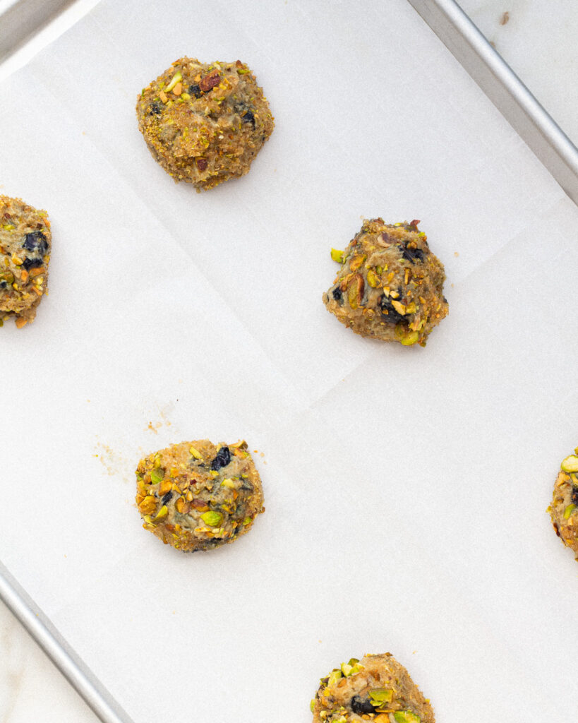 When the oven is ready, scoop the dough into 11 equal sized balls, about 55 grams each. Dip the tops and edges in the pistachio sugar to coat them, then place them sugar-side-up on parchment lined baking sheets.