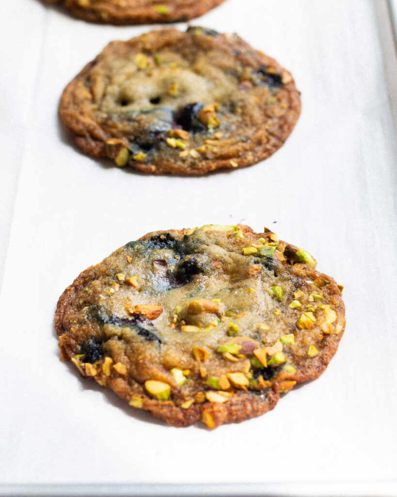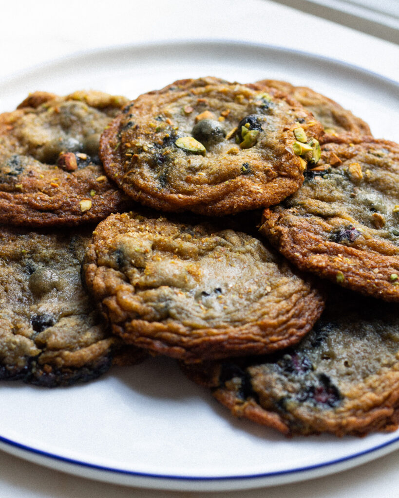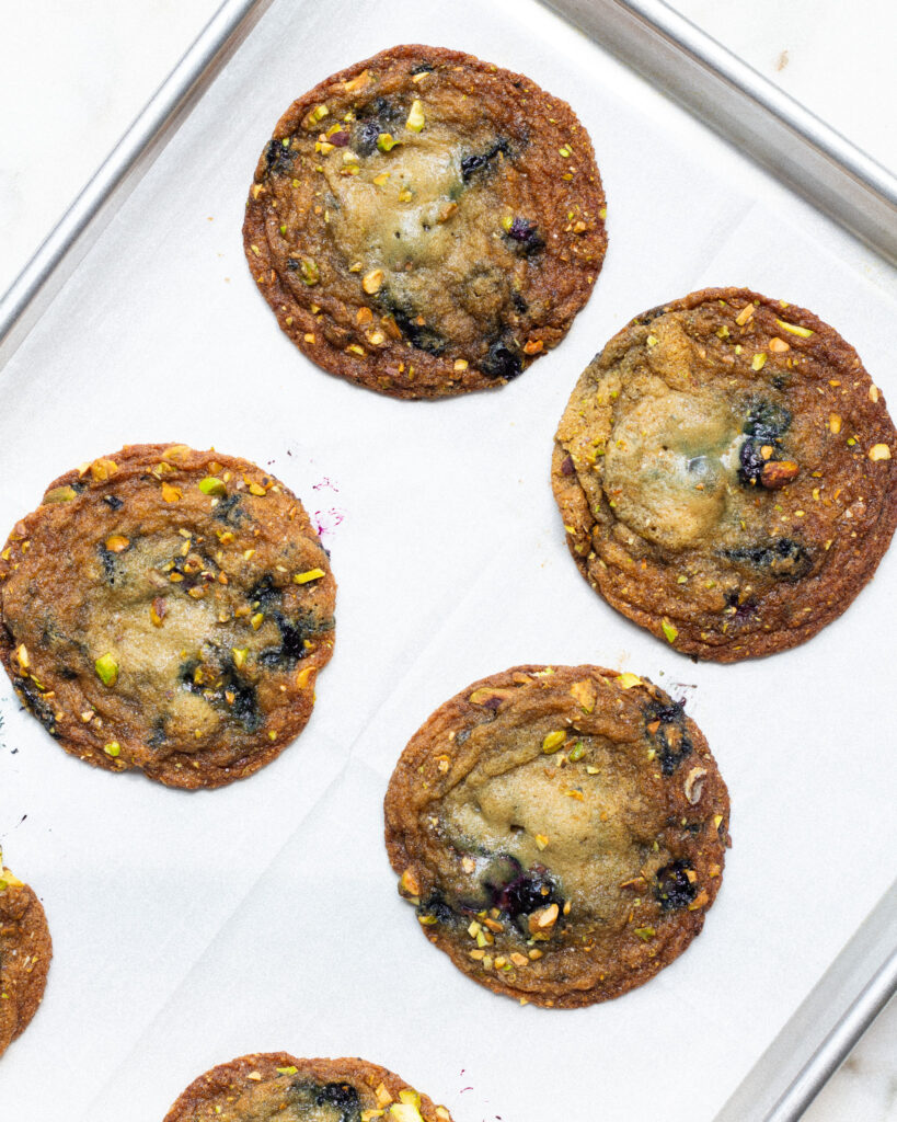 These brown butter blueberry cookies are a fun cookie, and my perfect combination of flavors. You have the sweet, jammy punchiness from the blueberries, the nutty, sugary coating from the pistachio sugar, and of course, that depth of flavor from the brown butter. It’s a unique cookie, but one that I absolutely love to make for those days I’m not craving your typical chocolate chip cookie.