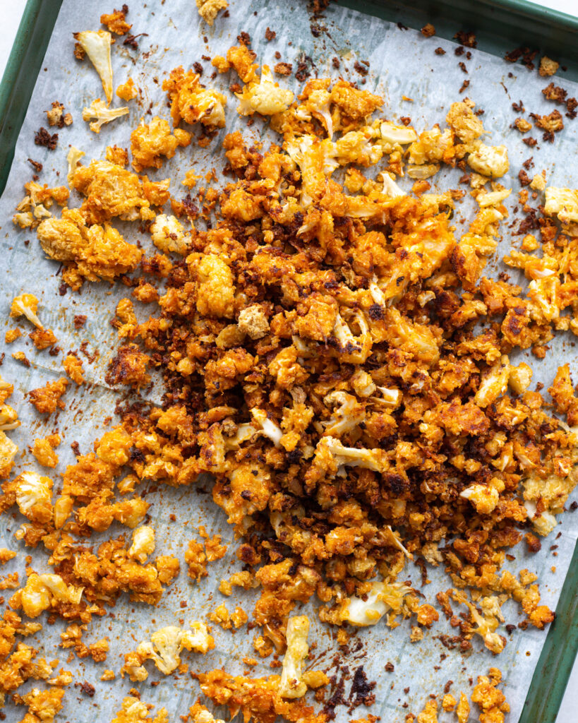 The chickpea-coated cauliflower is the trickiest part of this recipe (but it’s not mandatory! See the notes section in the recipe box below). The key is that the moisture from the chickpeas will help them cling to the raw cauliflower, making it so that the cauliflower feels almost “breaded” by the chickpeas, but no dredging, soaking or dipping is required.