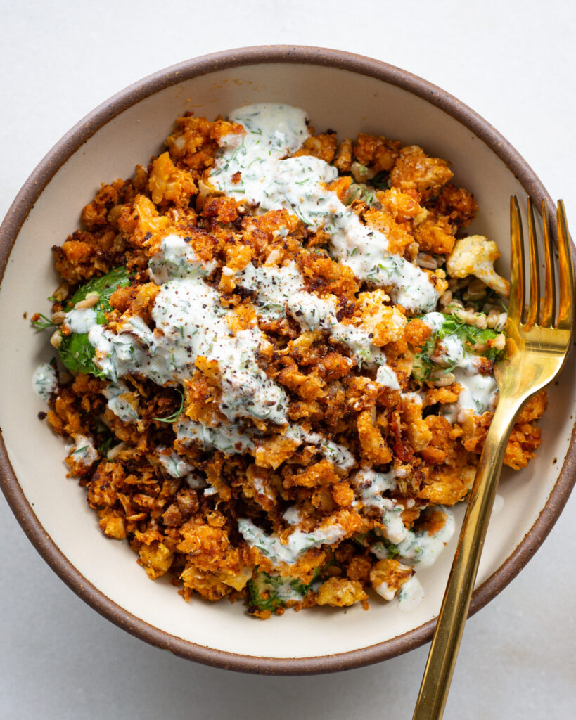 When the cauliflower is out of the oven, toss everything into a bowl. I like to start with the farro salad, then add the buffalo cauliflower, and drizzle on a healthy amount of the dressing. It’s a messy bowl, but absolutely worth every bite.