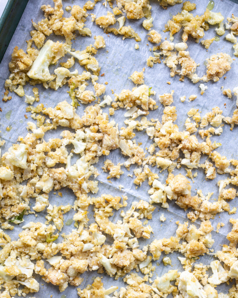To do this, roughly chop up the cauliflower florets. In a small food processor, add 1/2 of the cauliflower and 1/2 of the chickpeas. Pulse until the chickpeas are in small pieces and the cauliflower is in chunks. Spread this batch out on a parchment-lined baking sheet. Repeat with the remaining chickpeas and cauliflower and spread those out on a separate baking sheet.