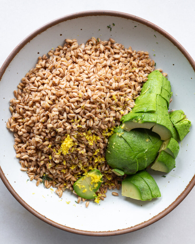 - Cook the farro according to package instructions. Add it to a large bowl. Finely chop the dill and add 3/4 of it to the farro. Dice and add the avocado, and add the zest from the lemon. Toss to combine.