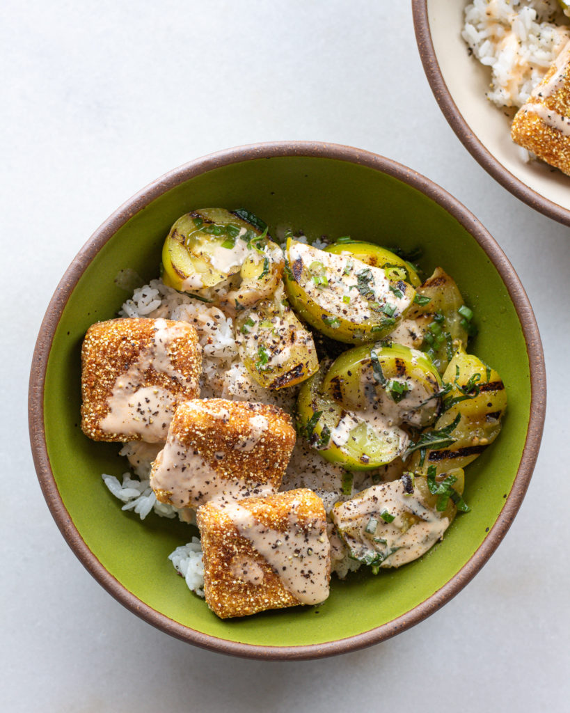 “Fried Green Tomatoes” is my favorite movie (or at least one of them), and this cornmeal crusted tofu recipe with grilled green tomatoes is like my version of that movie, but in recipe form. This is peak comfort food, it just feels like a warm hug. And yes, it does take a bit of effort to make, but that effort just means there is so much love in the recipe. Plus, you can always twist and tweak it a bit to make it a bit more doable on a weekday.