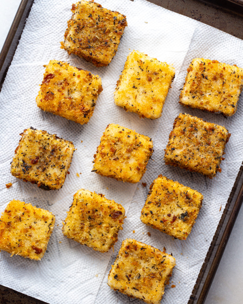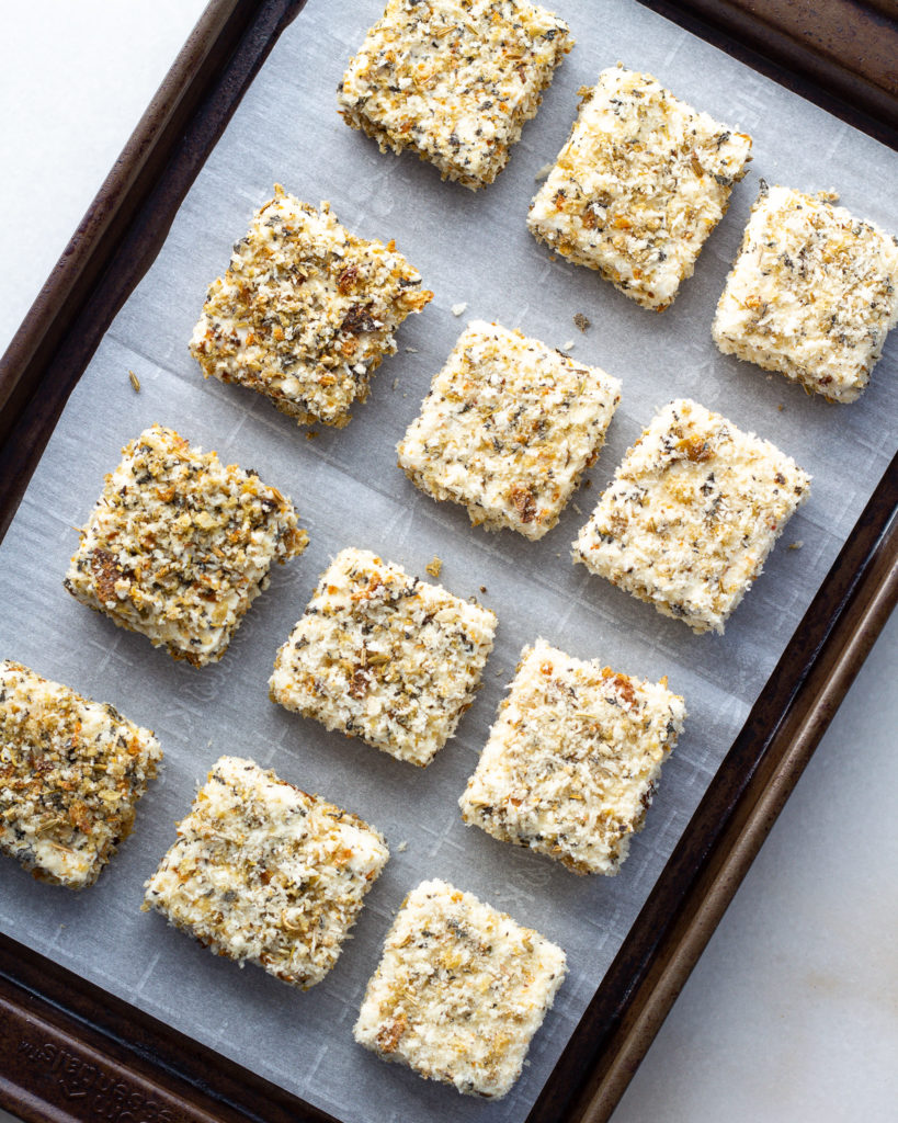 - Bread the tofu in cornstarch, then dredge in plant-based milk, then coat again in a thicker coating of breadcrumbs/seasonings. From here either bake or shallow fry the tofu.