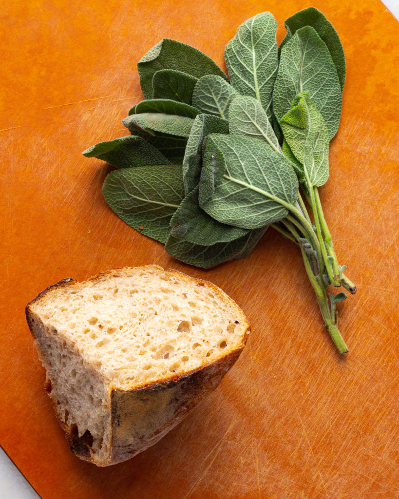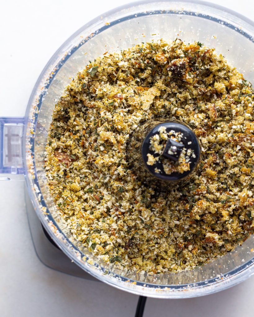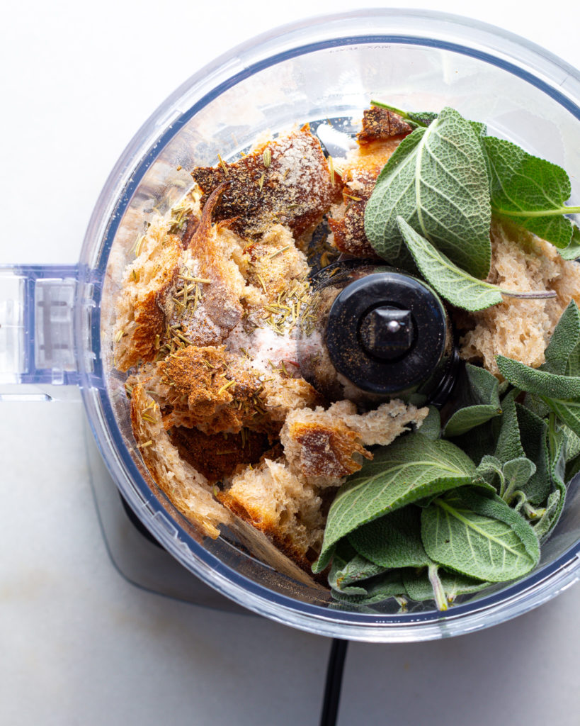 - In a high powered blender or food processor, combine the sage, bread pieces and spices. Pulse until you get an even breadcrumb. Season this mixture with salt and pepper to taste.