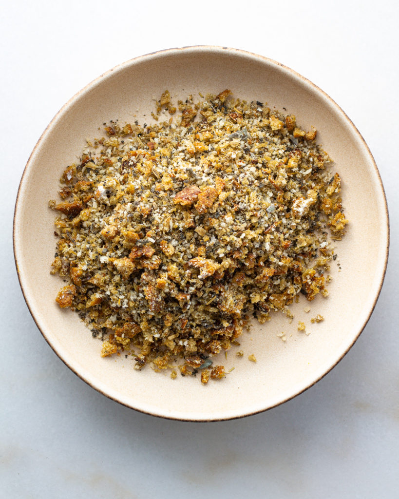 - 3 slices day-old sourdough bread, or one cup breadcrumbs of choice