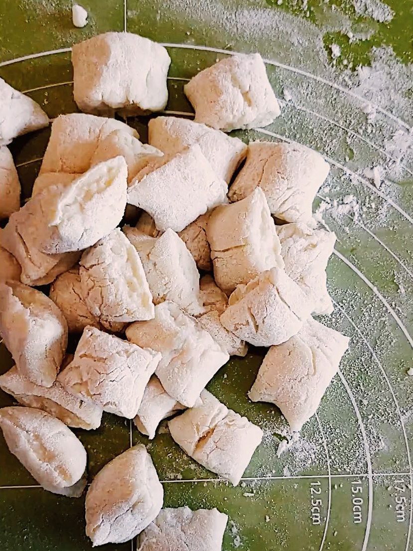 - After the dough has rested, cut into four equal pieces and roll them out into long tubes, about 12-18 inches in length and 1 inch in diameter. Cut into 1 inch pieces.