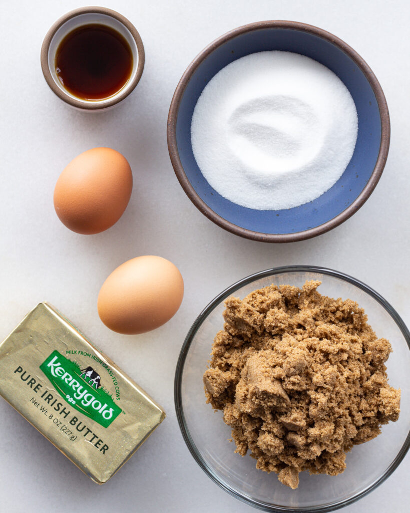 - Add the sugars to the stand mixer and mix on medium to create a gravely mixture. Add in the mostly cooled brown butter and beat until smooth and fluffy, about 3-4 minutes on medium. Add the vanilla and eggs and beat on medium high until the dough is very fluffy and smooth, about 2-3 minutes more.