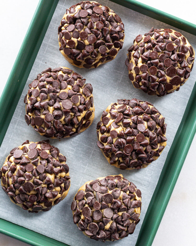 - Using a scale, portion out the dough into 6 portions, each weighing a little over 6 ounces. Dip the top of the cookies into the chocolate chips, smashing any chocolate chips into open crevasses. To avoid oven drama, make sure none are too close to the bottom of the cookie, we don't want the chocolate chips to melt onto the pan.