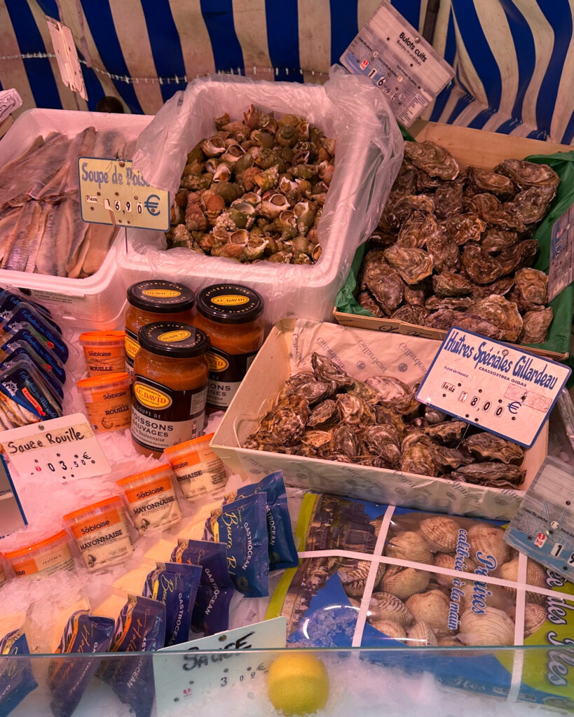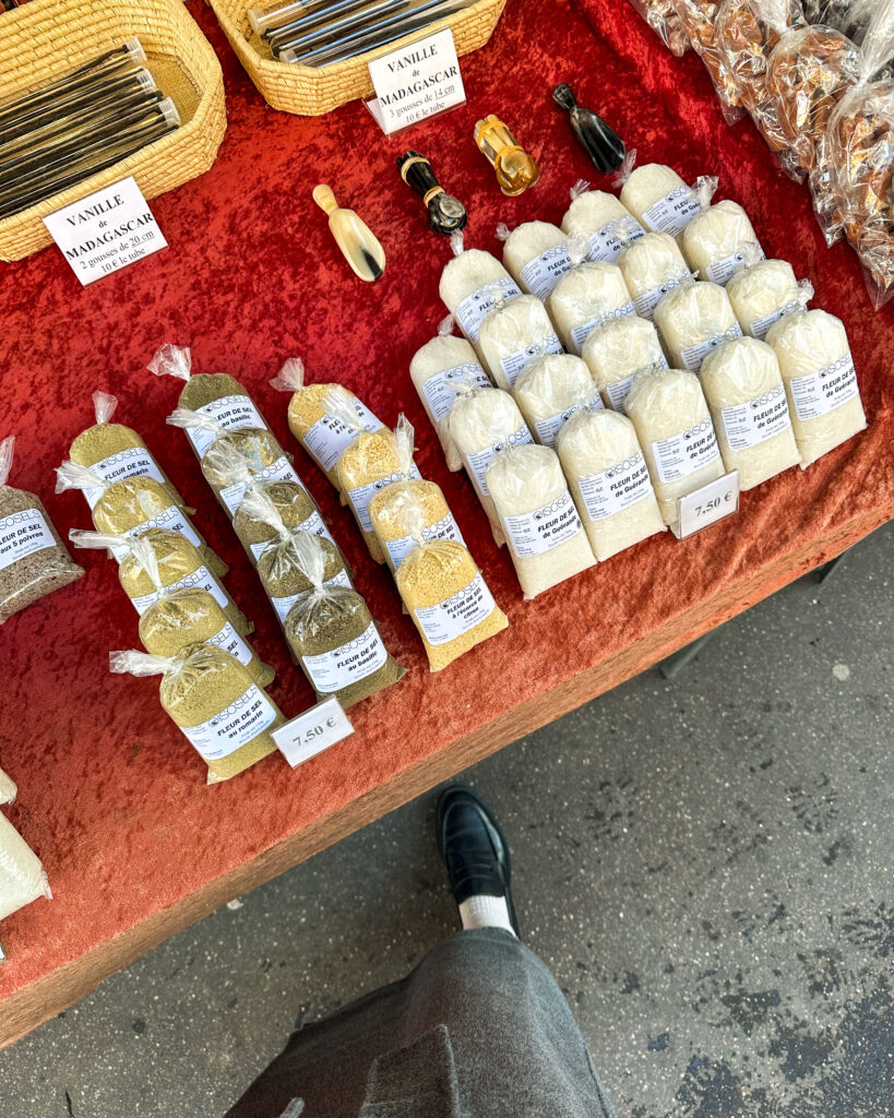 After flowers, our first big stop was the Marche Raspail, the market that Ina says made her fall in love with Paris. She mentioned in a recent interview the first thing you smell is the potato pancakes, so I had been saving myself for those. There’s a vendor who sells Fleur de Sel and Moroccan vanilla beans, both of which are a treat. The fish market inside will also clean and fillet whole fish as you need, which was so fun and something I wish we had at my market.