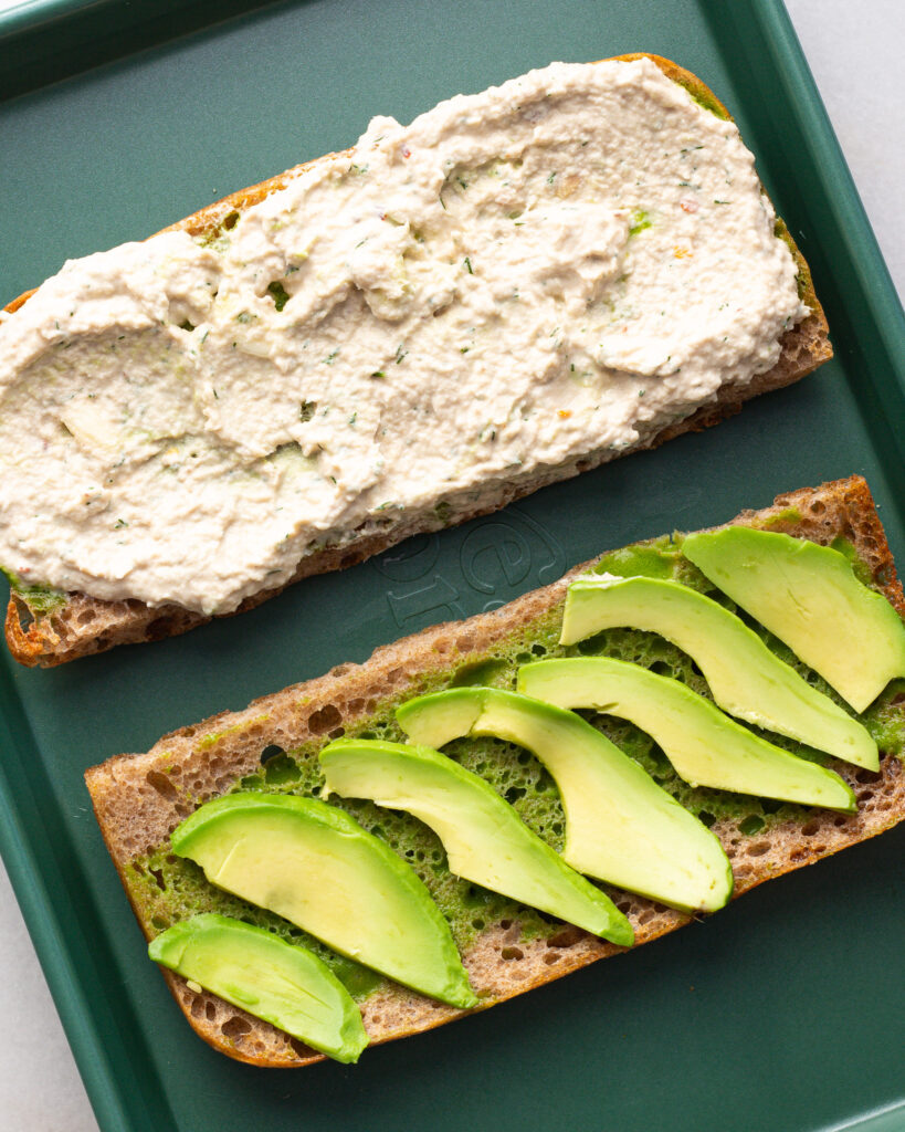 - Slather both sides of the bread with the basil oil, then add sliced avocados on one side, and half of the tuna mixture on the other. Optional (and if they are in season!) add 2 slices of tomatoes to the avocado.