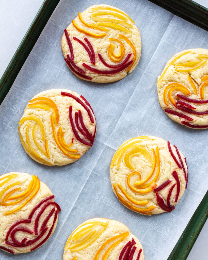 - Using your hands and a lot of patience, closely nestle the candied citrus peels on top of the cookies in the design you prefer. Get the peels as close together as possible.