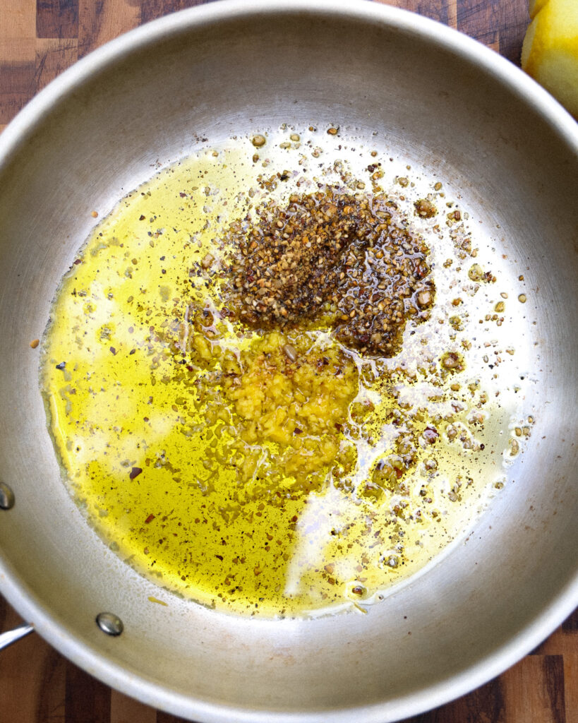 The process is really all about making the zesty sesame + lemon oil. You’ll need to add the lemon zest, sesame seeds, Aleppo pepper and oregano to a medium sauté pan. Cover with olive oil, making sure everything is submerged.