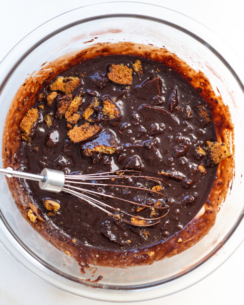 - In a separate bowl, mix together the condensed milk, bourbon, and cocoa powder until it is smooth.