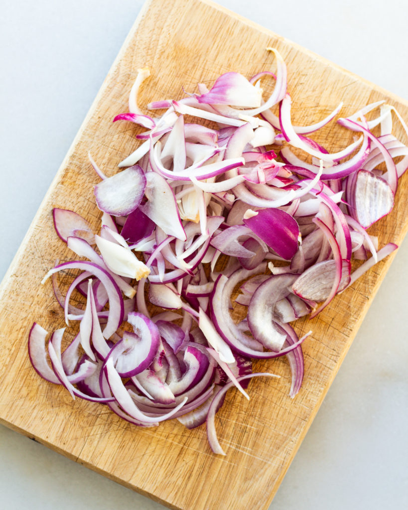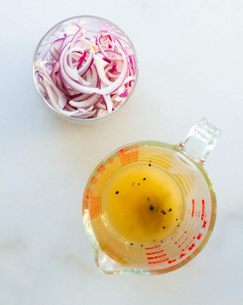 - Thinly slice the red onion. Use your hands to make sure all the pieces are separated and add them to a glass jar.