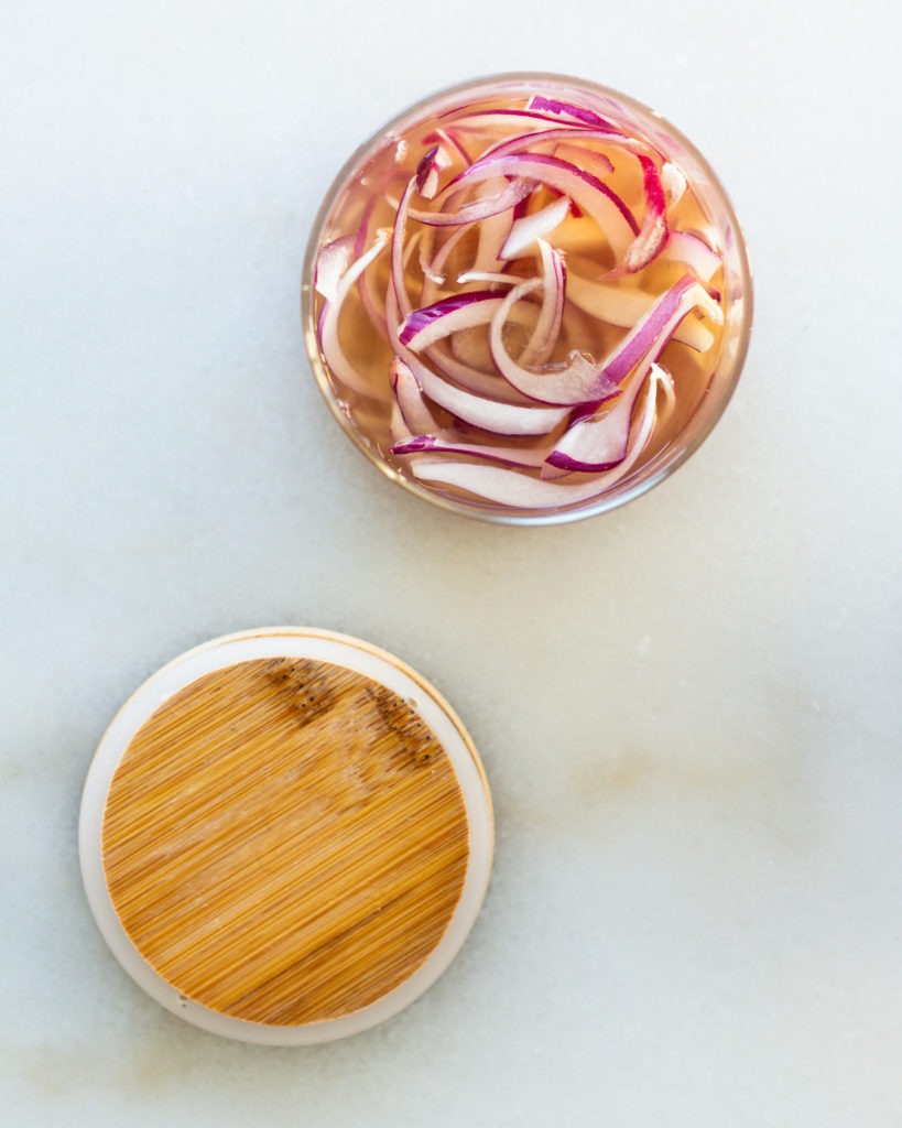 This quick pickled recipe is super simple. Just mix the ingredients and pour them over the onions. Here is everything broken down into specifics: