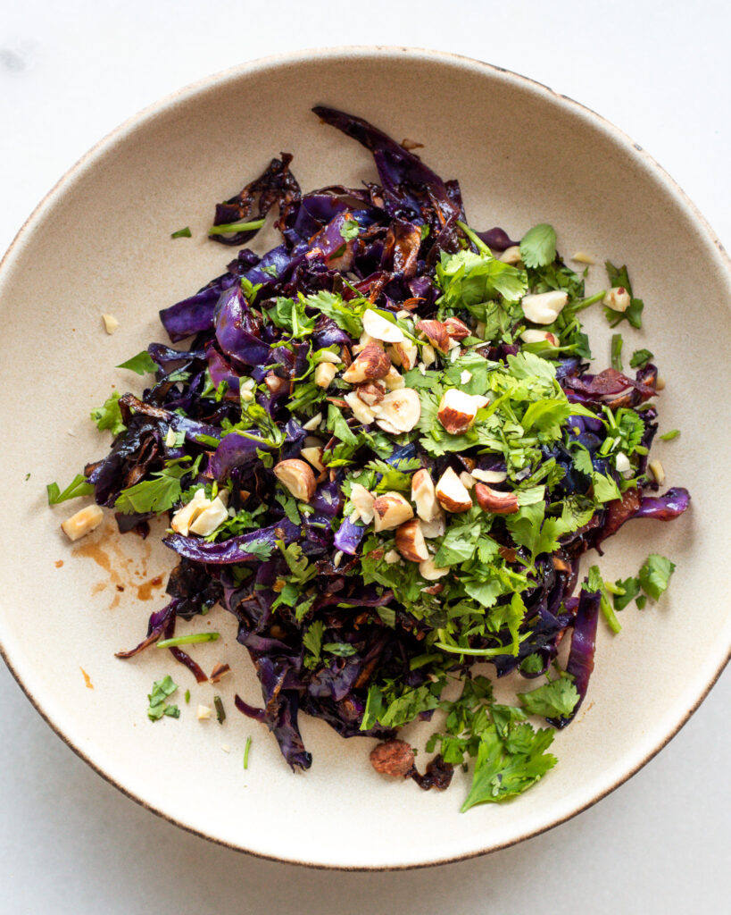 - When the cabbage is out of the oven, pour the sambal mixture directly on top and give it a toss to coat.