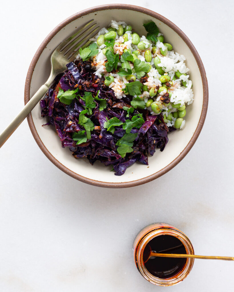 - To serve, add a pile of cabbage to the plate and top with the rice and edamame. Sprinkle with cilantro, hazelnuts and chili oil. Mix and serve!