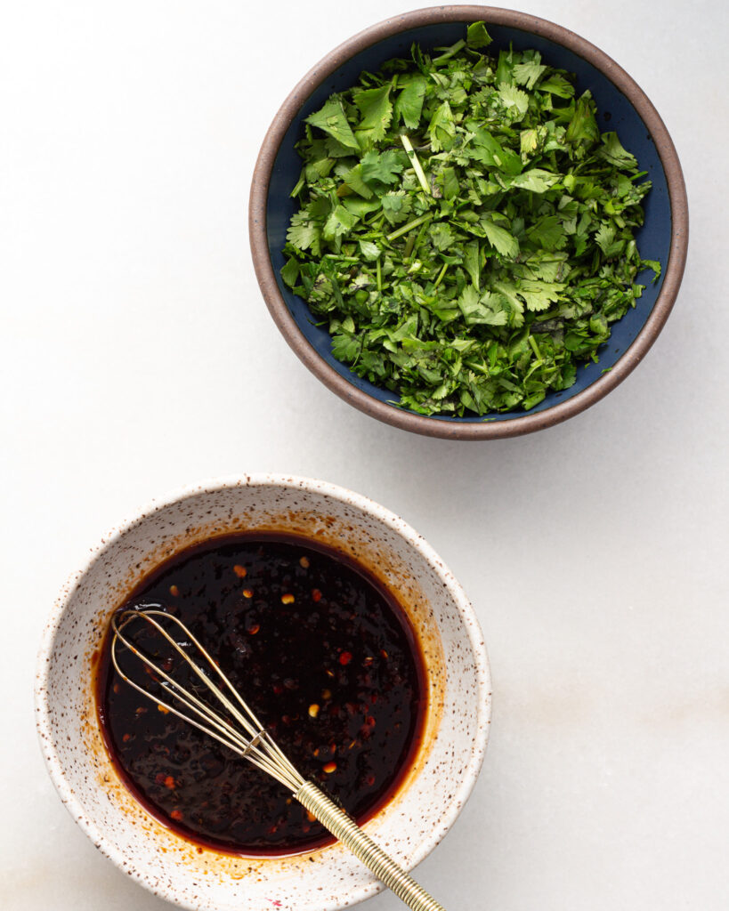 - While the cabbage is roasting, whisk together the sambal oelek and kecap manis. Roughly tear the cilantro.