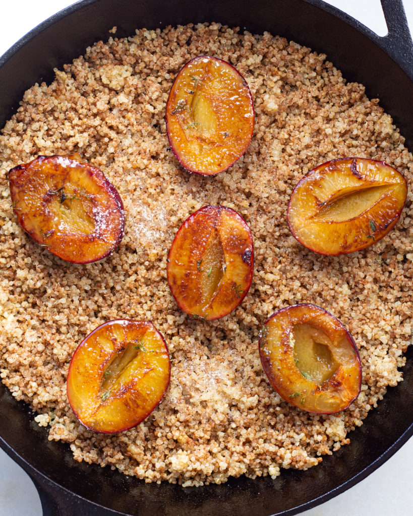 - Spread the plums on top of the quinoa and sprinkle the remaining 1 tbsp of granulated sugar on top. Bake this at 400°F for 20-25 minutes or until the plums are very jammy and the quinoa has slightly crisped on top.