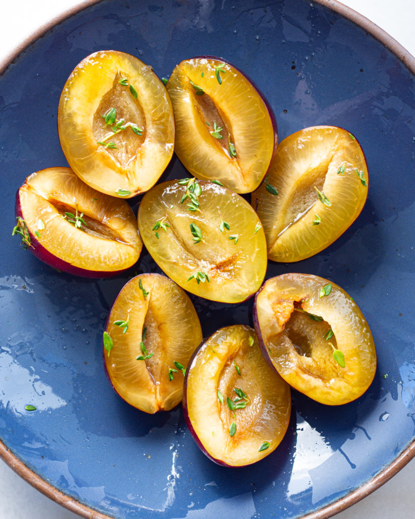 - Slice all the plums in half and remove the pits. In a large bowl, toss them with the vanilla, red wine vinegar, thyme leaves, and 1 tbsp of the granulated sugar. The plums should start to release their natural juices, this is a good thing!