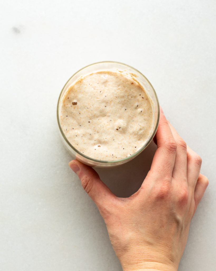 This will give you 120 grams of total activated starter, which means 60 grams to use in the recipe, and 60 grams of starter to keep for later. You want to have some leftover starter so that you can keep using it. If we use it all at once, then we’d have to make a whole starter again, and that can take up to 7 days (which um…no thank you).
