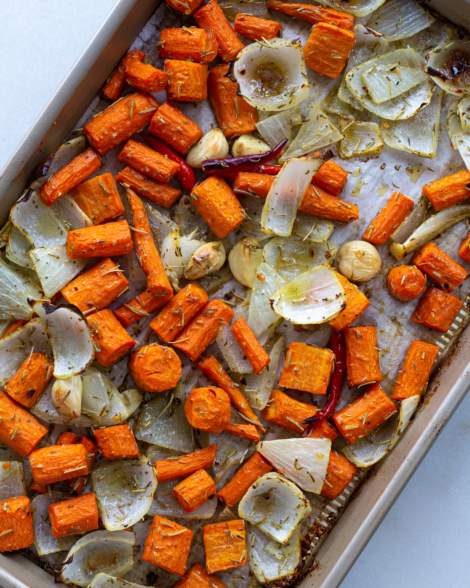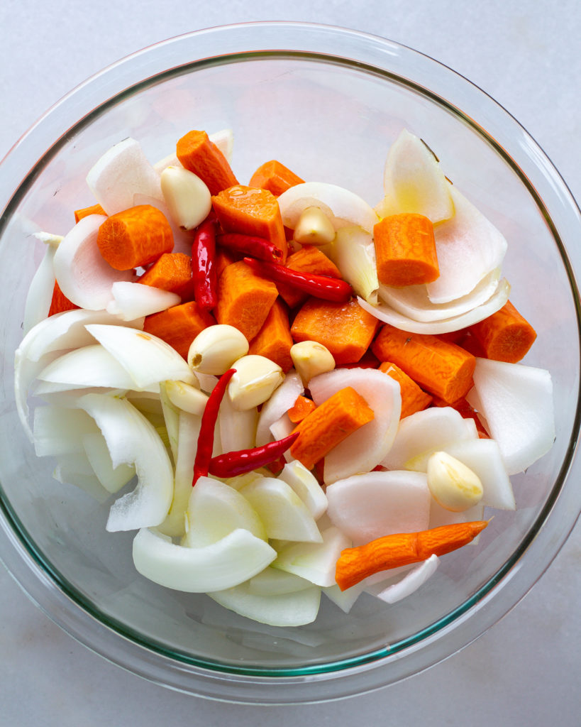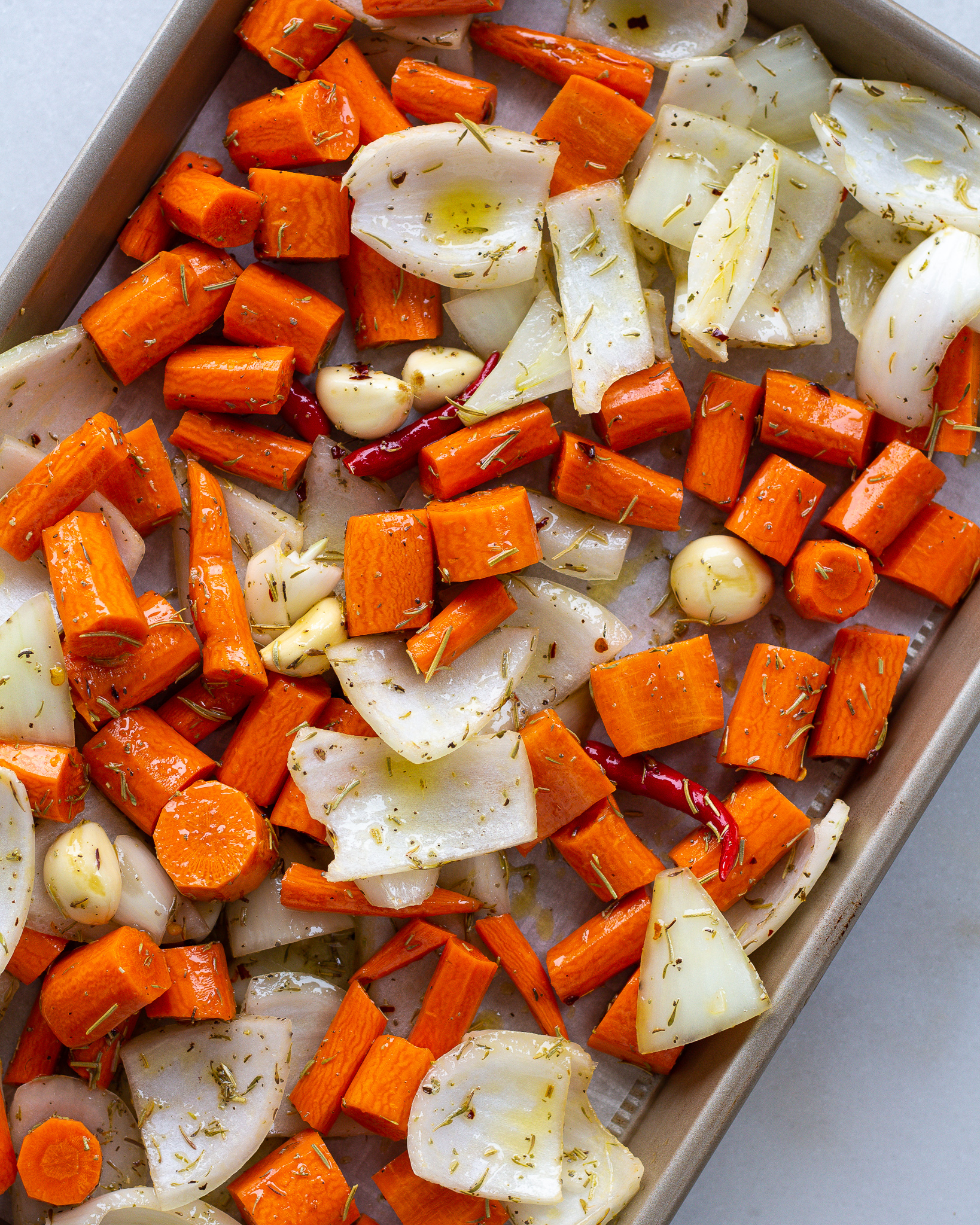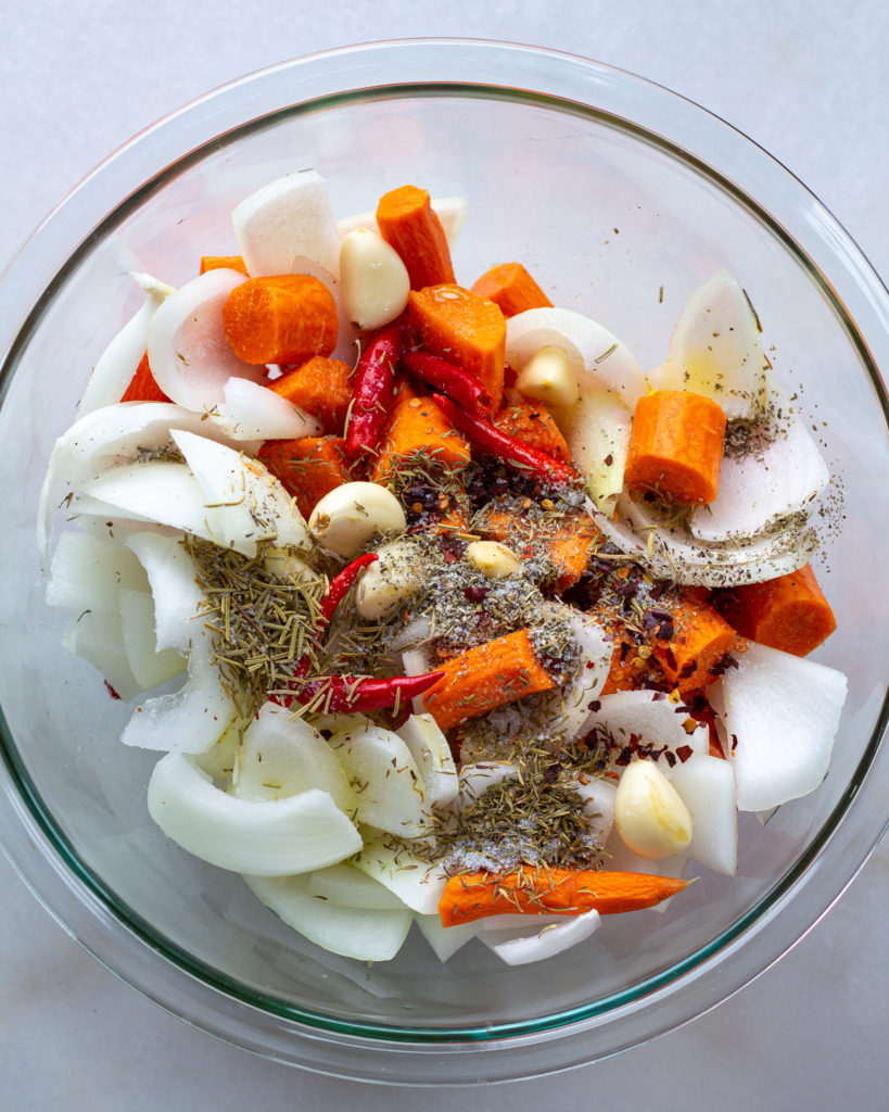 - Add the carrots, onion, garlic and pepper to a bowl and cover with 3 tbsp of olive oil. Add the rosemary, thyme, sage, red pepper flakes and salt and mix with your hands until the vegetables are well coated.