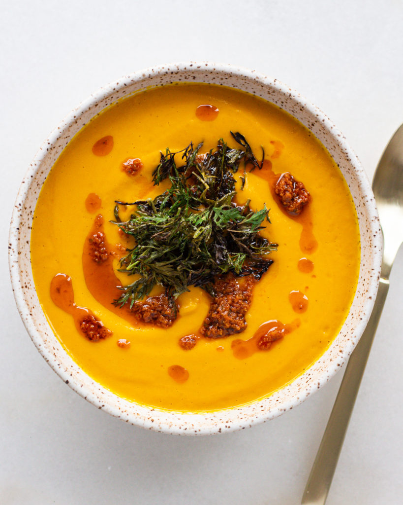 - Top the soup with the crispy carrot tops, pesto and coconut milk and serve!