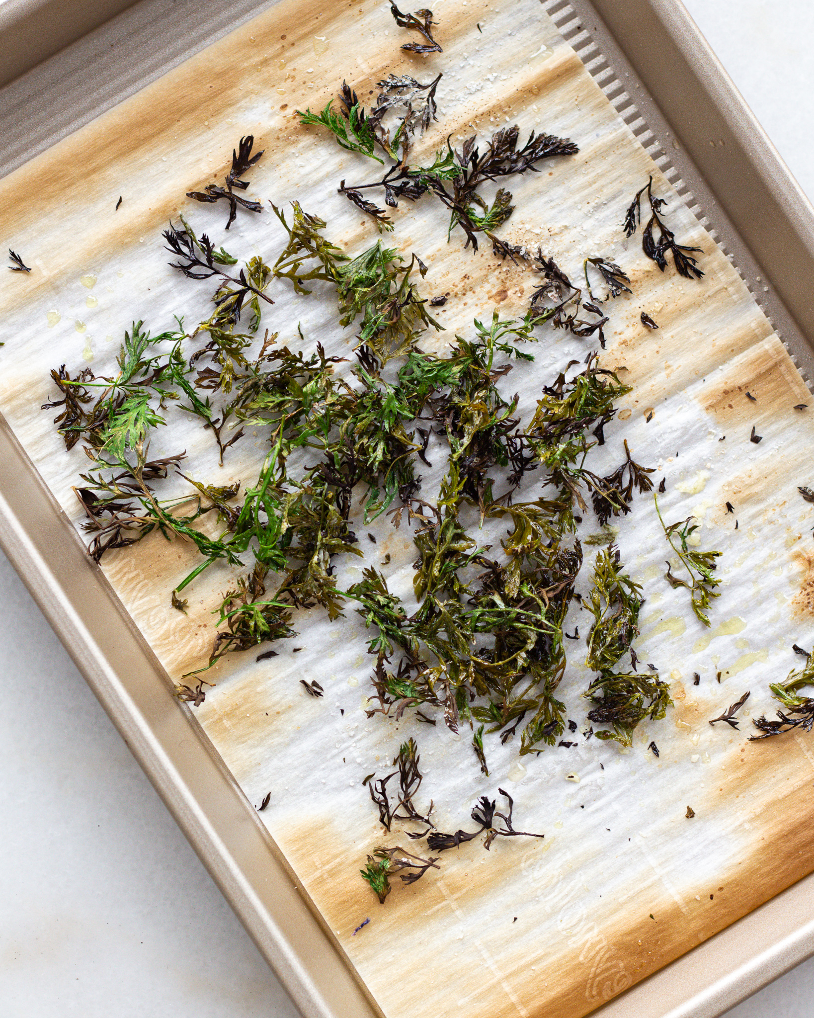 And my second answer is – they make such a great, healthy, textural addition. Carrot tops are small, light and perfect for crisping up in the oven. Compared to your other greens options, they really can’t be beat.