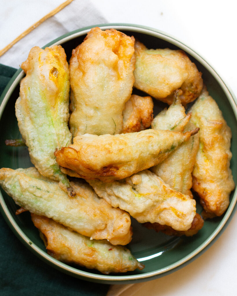 Now I do need to caveat: there is nothing wrong with the original version, this just happens to be my preferred version! Plus, I love how it makes this squash blossom recipe accessible to all diets, too. I’m still working on how to make a gluten-free version, but for right now I’ve found rice flour is a pretty solid substitute!