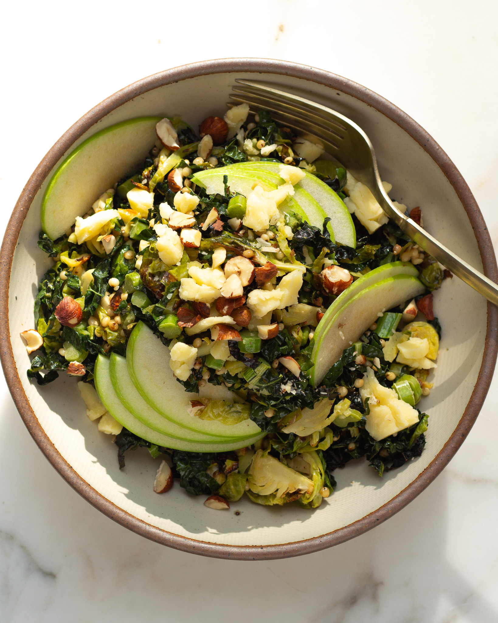 Baked Kale Salad with Brussels Sprouts, Honey Mustard, Apple and Cheddar