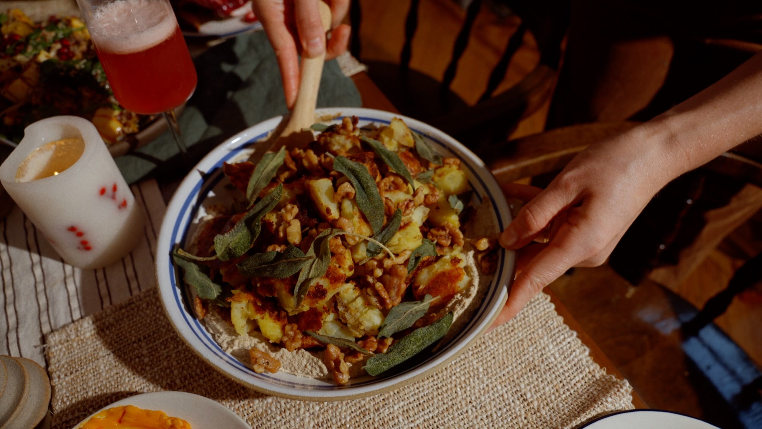 To serve, swipe the sage walnut spread along the sides of a bowl or serving dish, then pile the potatoes on top. Sprinkle the brown butter walnuts and remaining fried sage on top and serve!