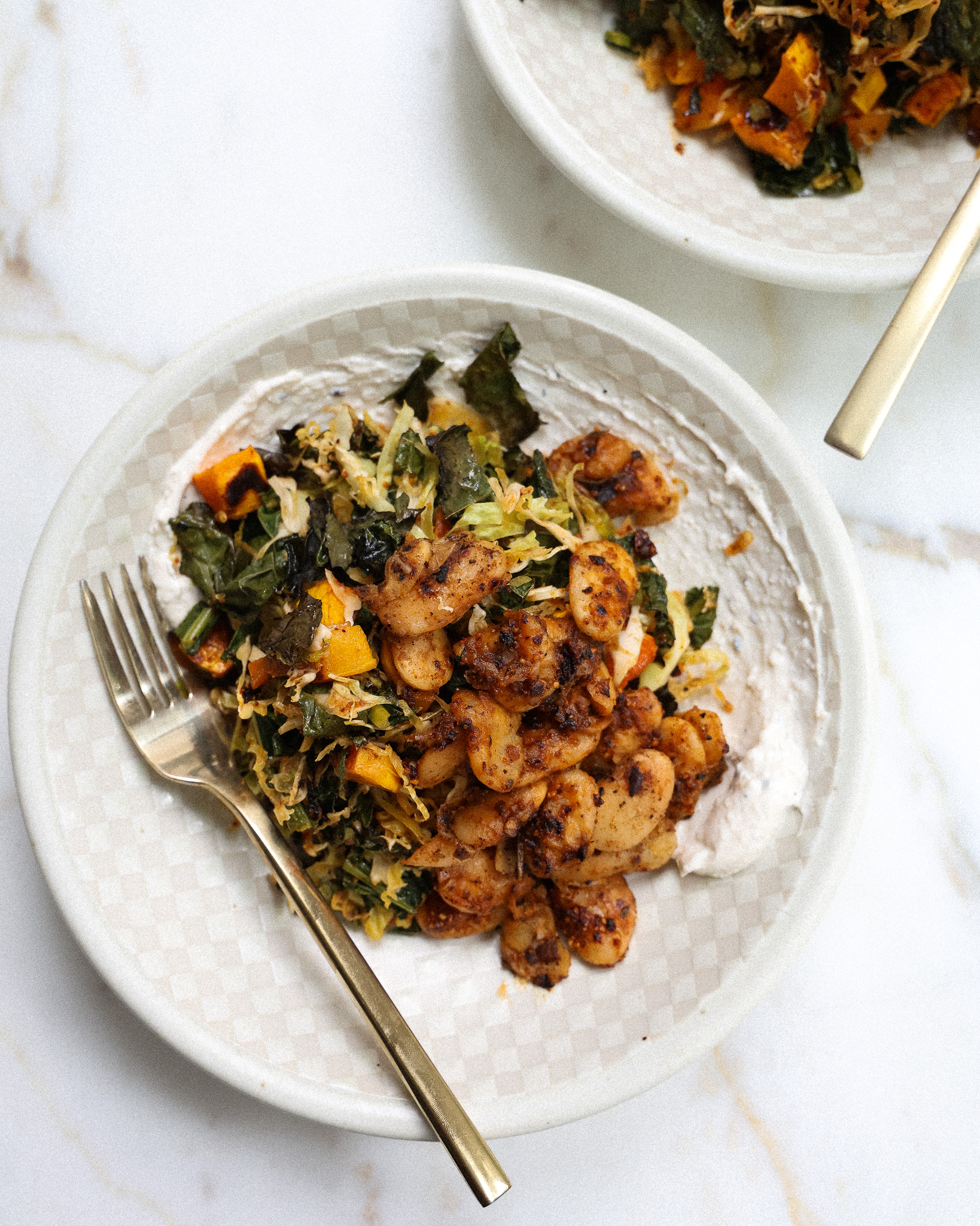 Place the kale on the top rack and the squash on the bottom rack. Roast both for 20-25 minutes, checking to see if the kale is beginning to brown and crisp. Roast up until 30 minutes, the kale should be softened with browning on the edges, the squash should be tender and charring on the sides.