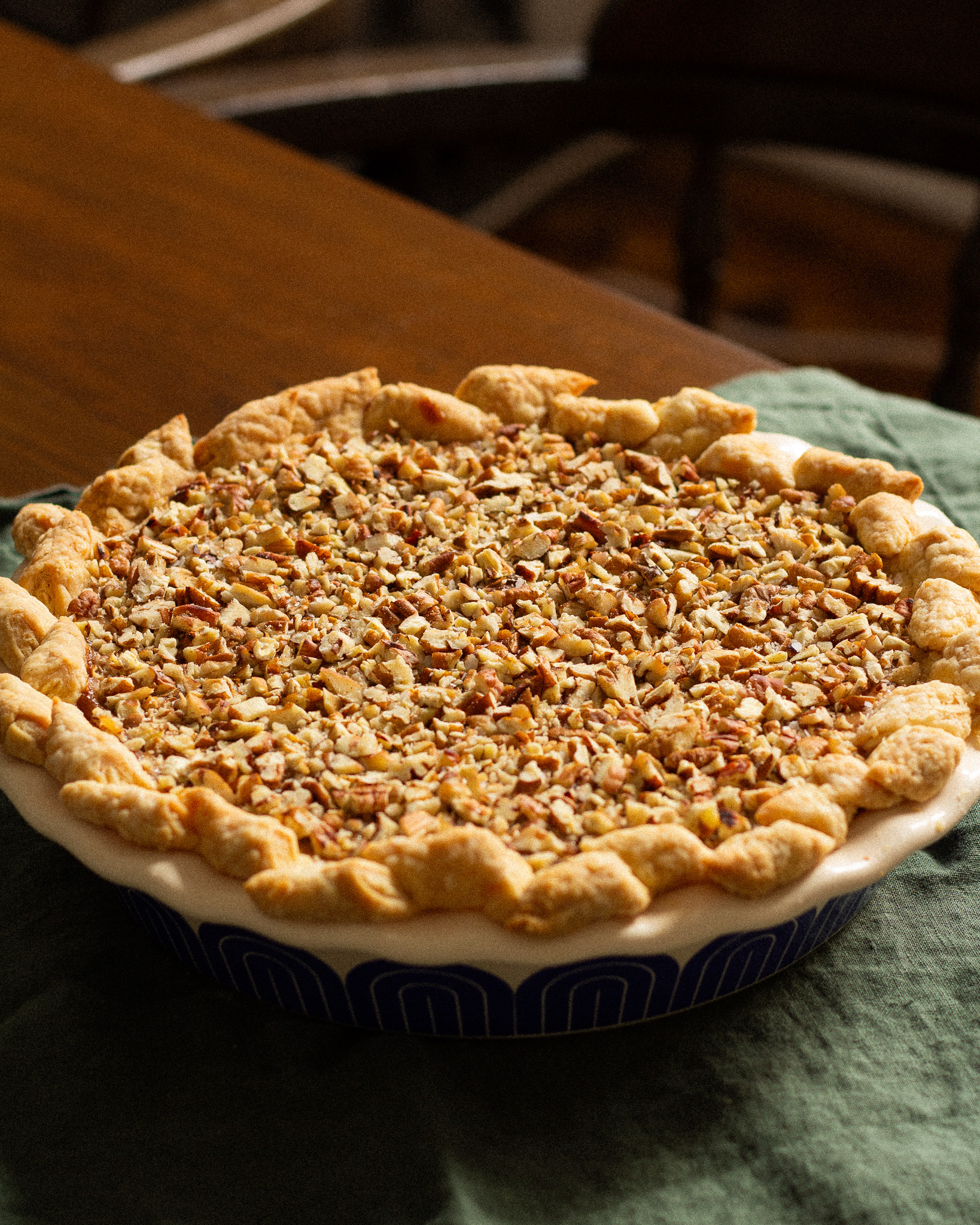 Move the pie dough to a lint-free tea towel and use the towel to press the ball together into a tight dough. Transfer this to the fridge for at least an hour, but it can hang out for up to a day. This also freezes well.